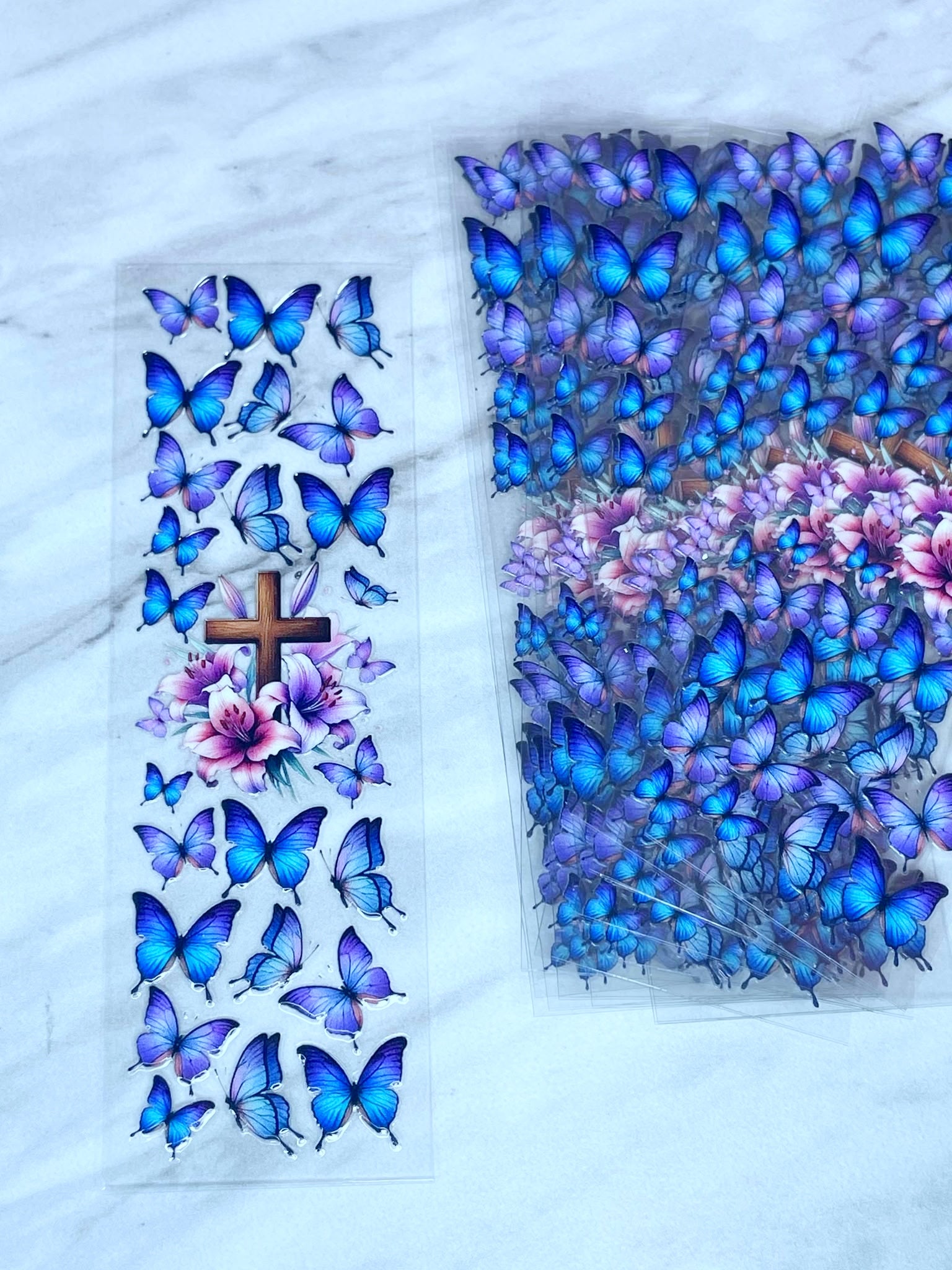 UV DTF Transfer cuts your craft time by 80%. They are white ink-backed permanent decals designed for use on hard surfaces, including dark colors.